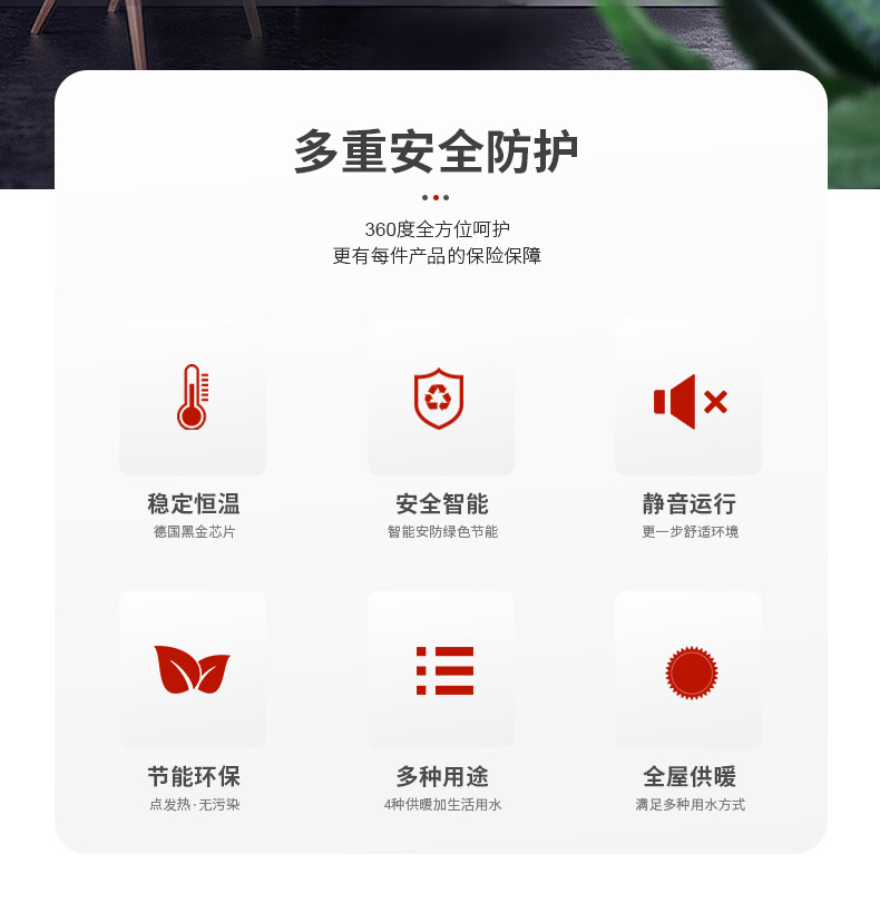 全設有雙重漏電保護,防干燒保護,不污染室內空氣,超溫報警,安全干擾升溫快熱效率高開機1分鐘,加熱器熱水由內膽向暖氣片循環。